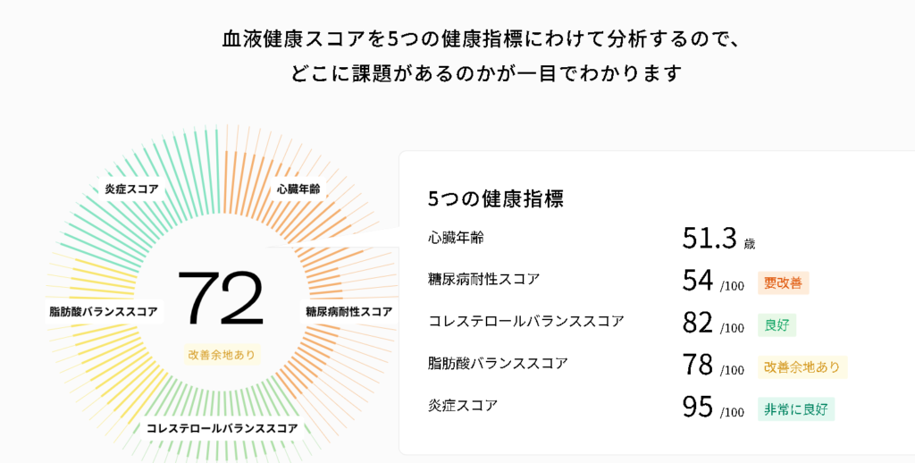 少量の採血で、 健康維持や寝たきり予防のためのあらゆる生活習慣病の発症リスクが点数で表示されます。また送られてくるレポートを見ると、より優先的に取組むべき予防行動が一目でわかりるようになっています。